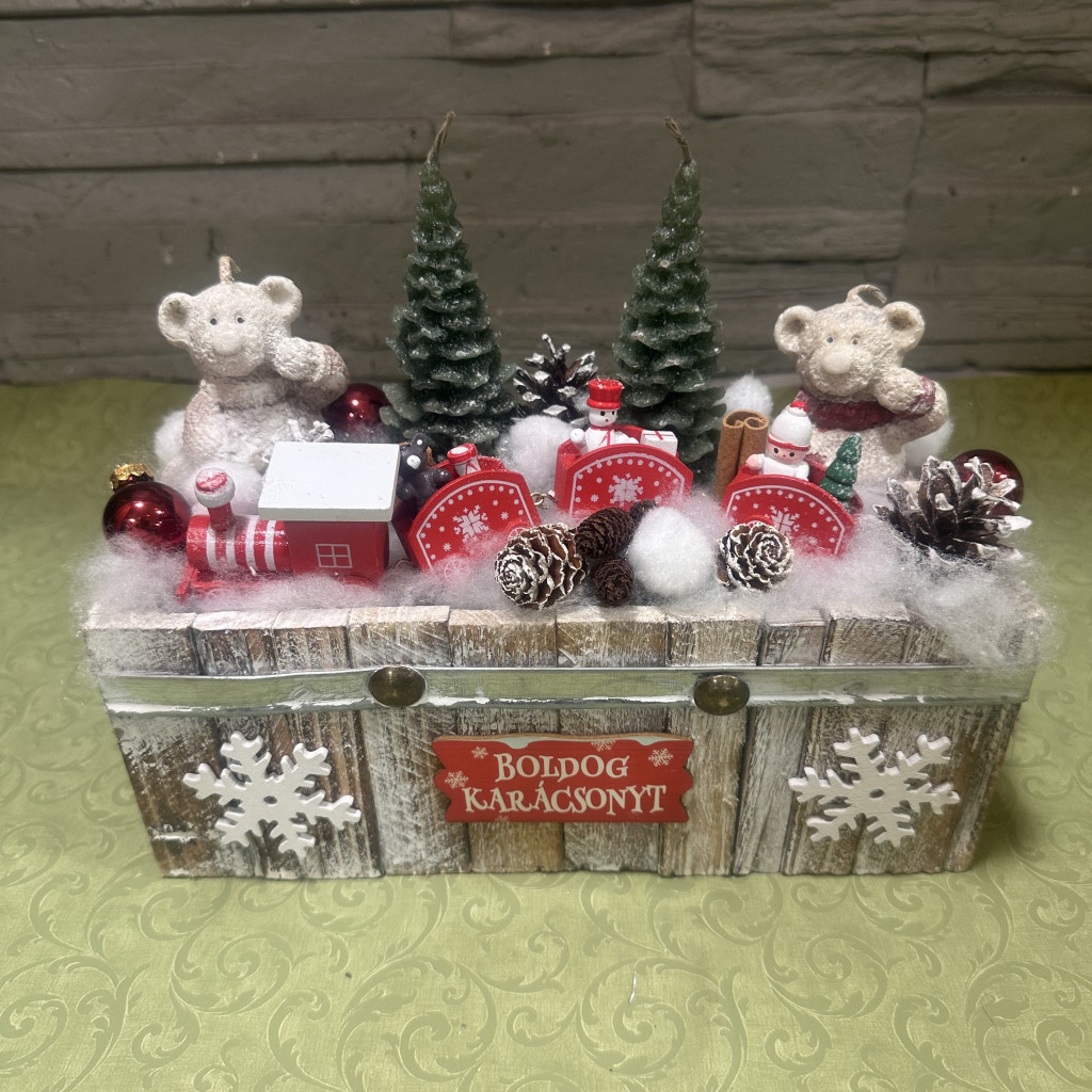 Fa dobozba készült adventi asztaldísz piros-fehér színvilágban. Különlegességét a 2 darab maci formájú és a 2 darab fenyő formájú gyertya rejti.