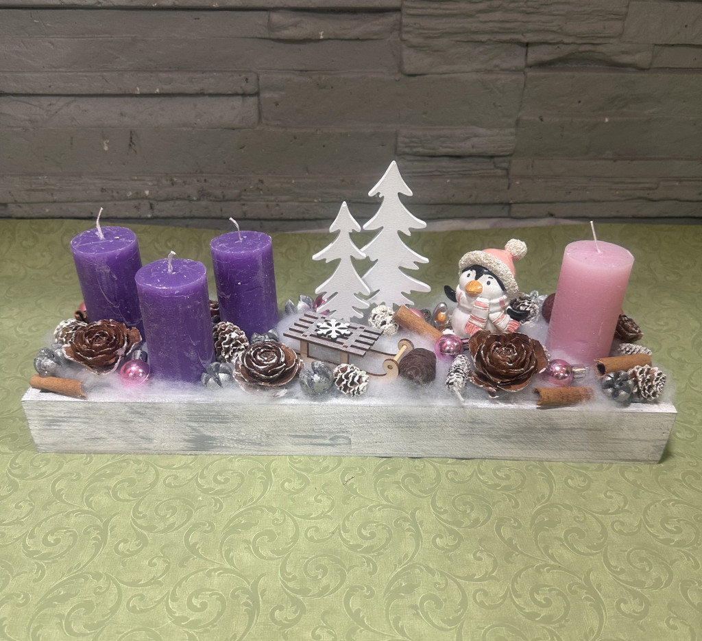 Fa dobozba készült adventi asztaldísz rózsaszín-lila-ezüst színvilágban.