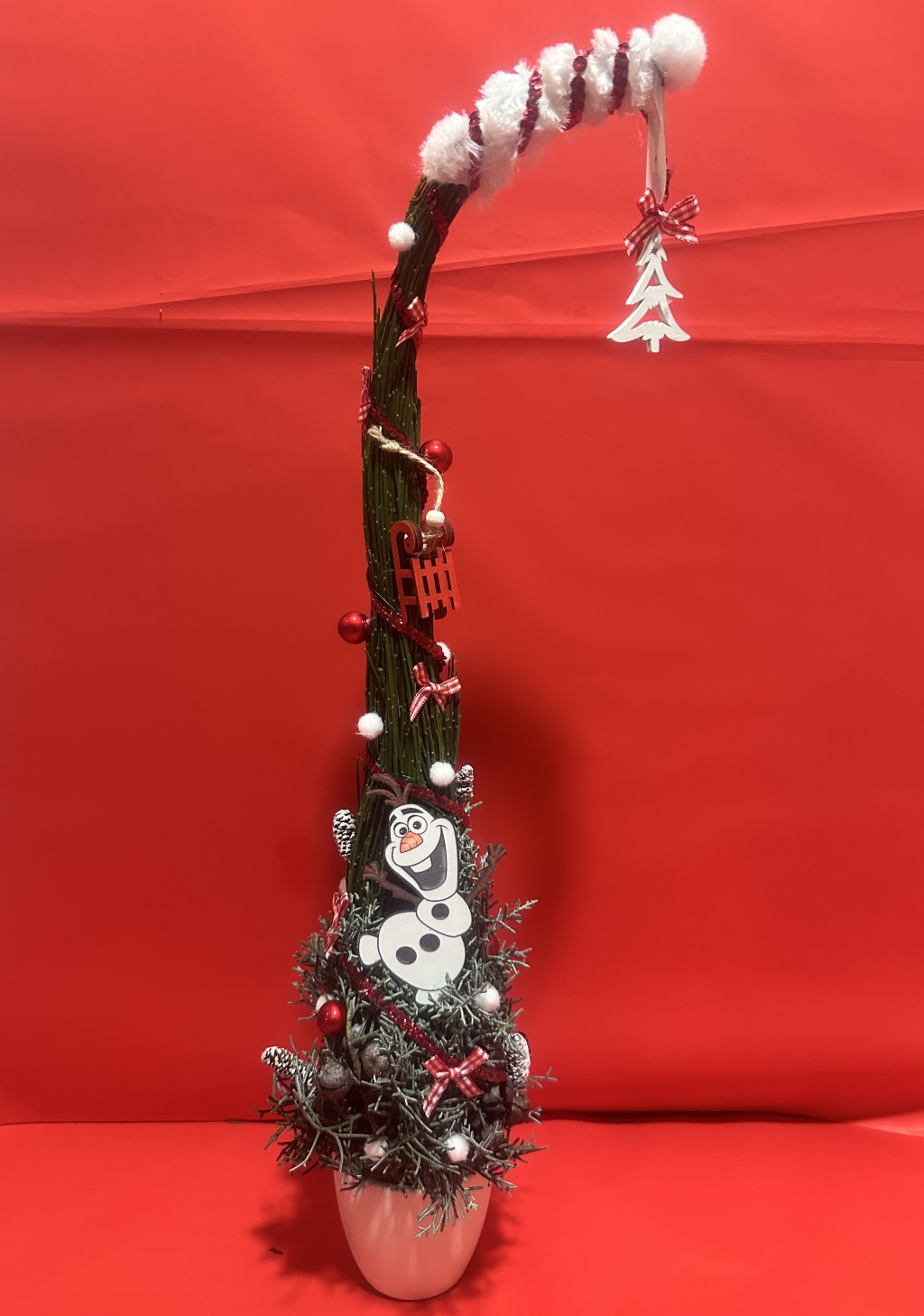 Kerámia kaspóba készült kb. 55 cm magas grincsfa piros-fehér színvilágban.