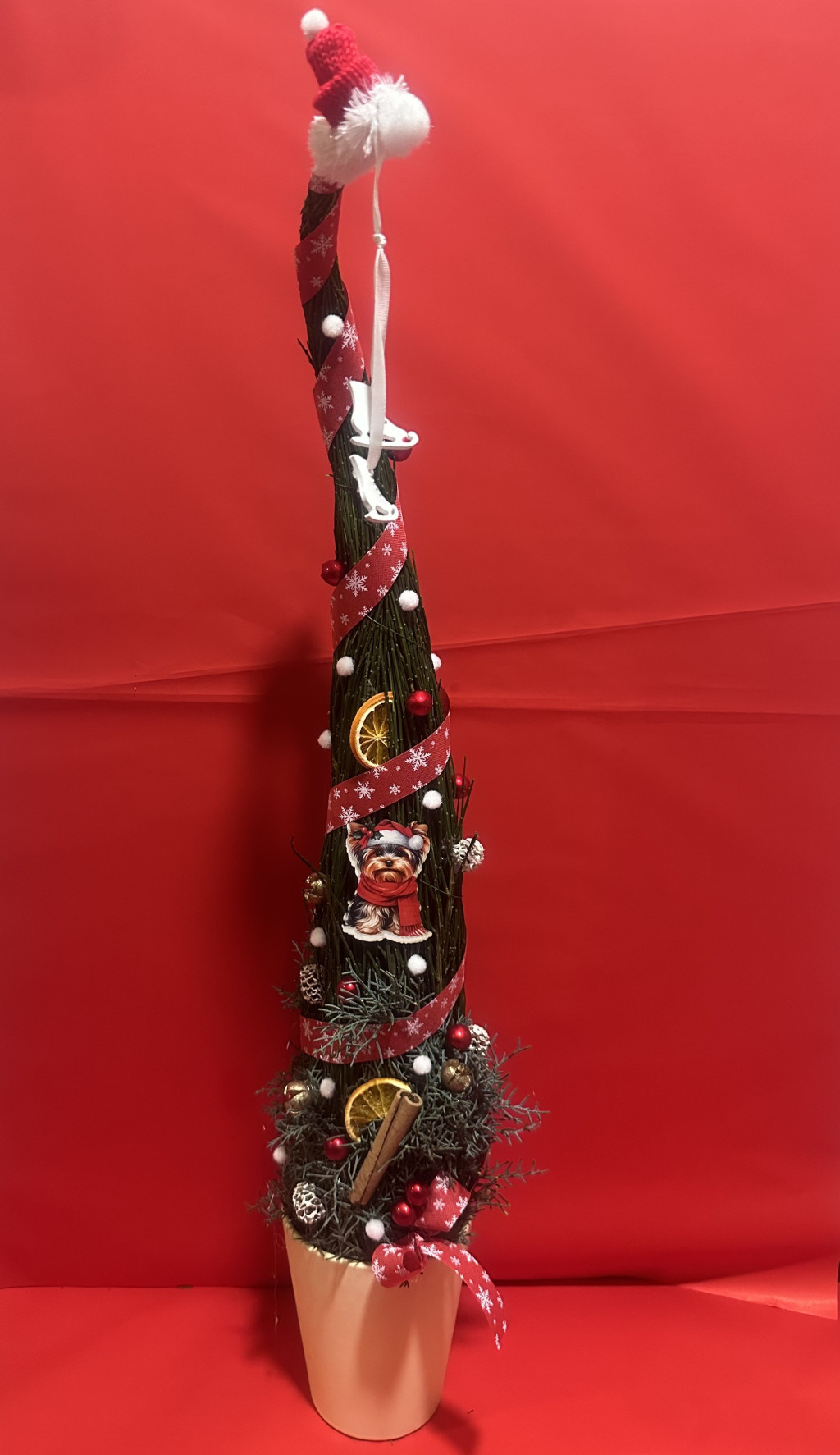 Kerámia kaspóba készült kb. 80 cm magas grincsfa piros-fehér színvilágban.