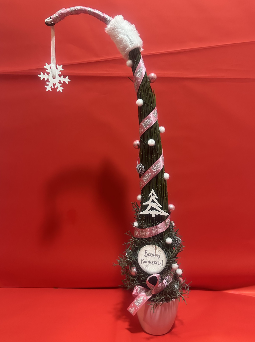 Kerámia kaspóba készült kb. 55 cm magas grincsfa rózsaszín-fehér színvilágban.