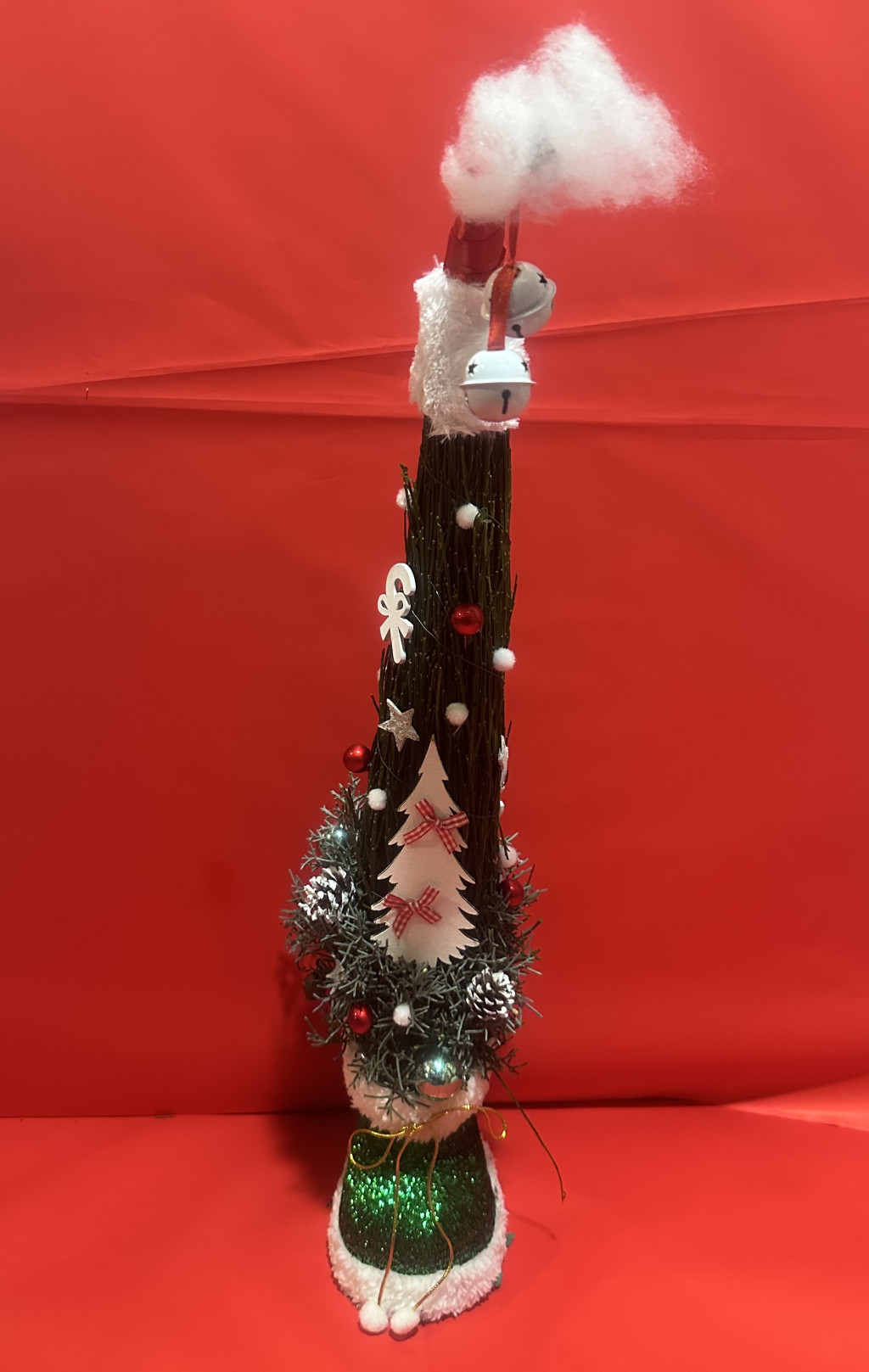 Manó cipőbe készült kb. 60 cm magas grincsfa piros-fehér színvilágban.