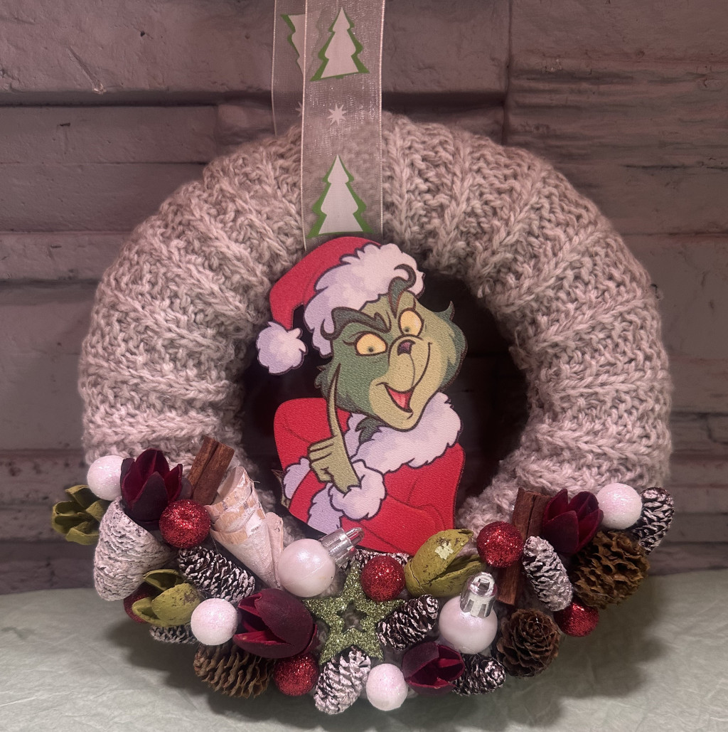 Kötött alapra készült kb. 20 cm átmérőjű karácsonyi ajtódísz Grincs figurával.