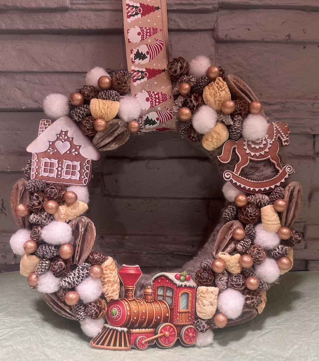 Kötött alapra készült kb. 25-30 cm átmérőjű karácsonyi ajtódísz. Mézeskalács házikóval, hintalóval és vonattal.