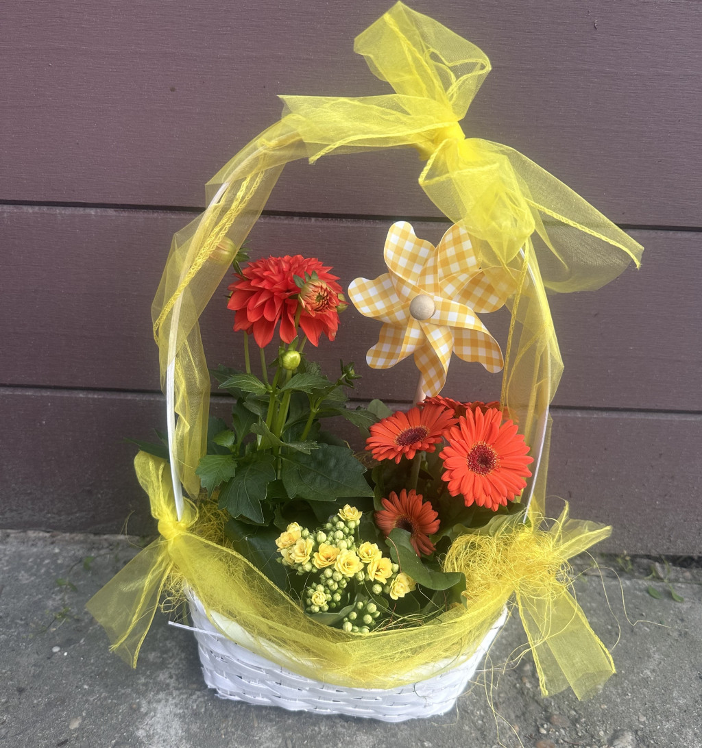 Cserepes növényekből készülő Májuskosár. Megtalálható benne: dália, korall, gerbera, egy szélforgóval kiegészítve.